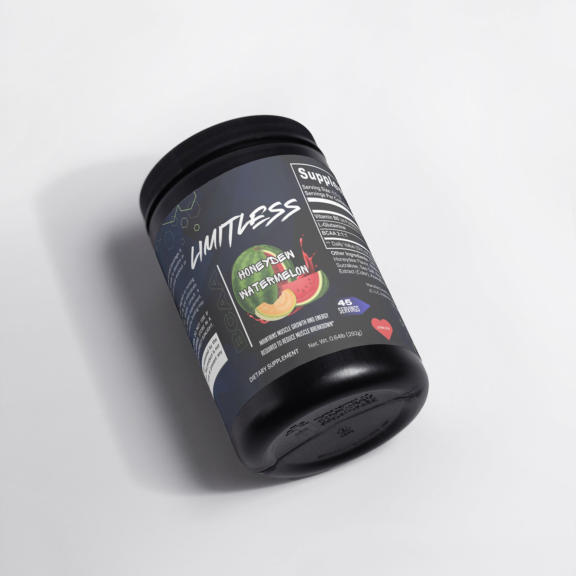 Ingredients: Vitamin B6 (as Pyridoxine Hydrochloride), L-Glutamine, BCAA 2:1:1, Citric Acid, Honeydew Flavor, Watermelon Flavor, Potassium Citrate, Silicon Dioxide, Sucralose, Sea Salt, Beet Powder (Color), Grape Skin Extract (Color), Acesulfame Potassium.